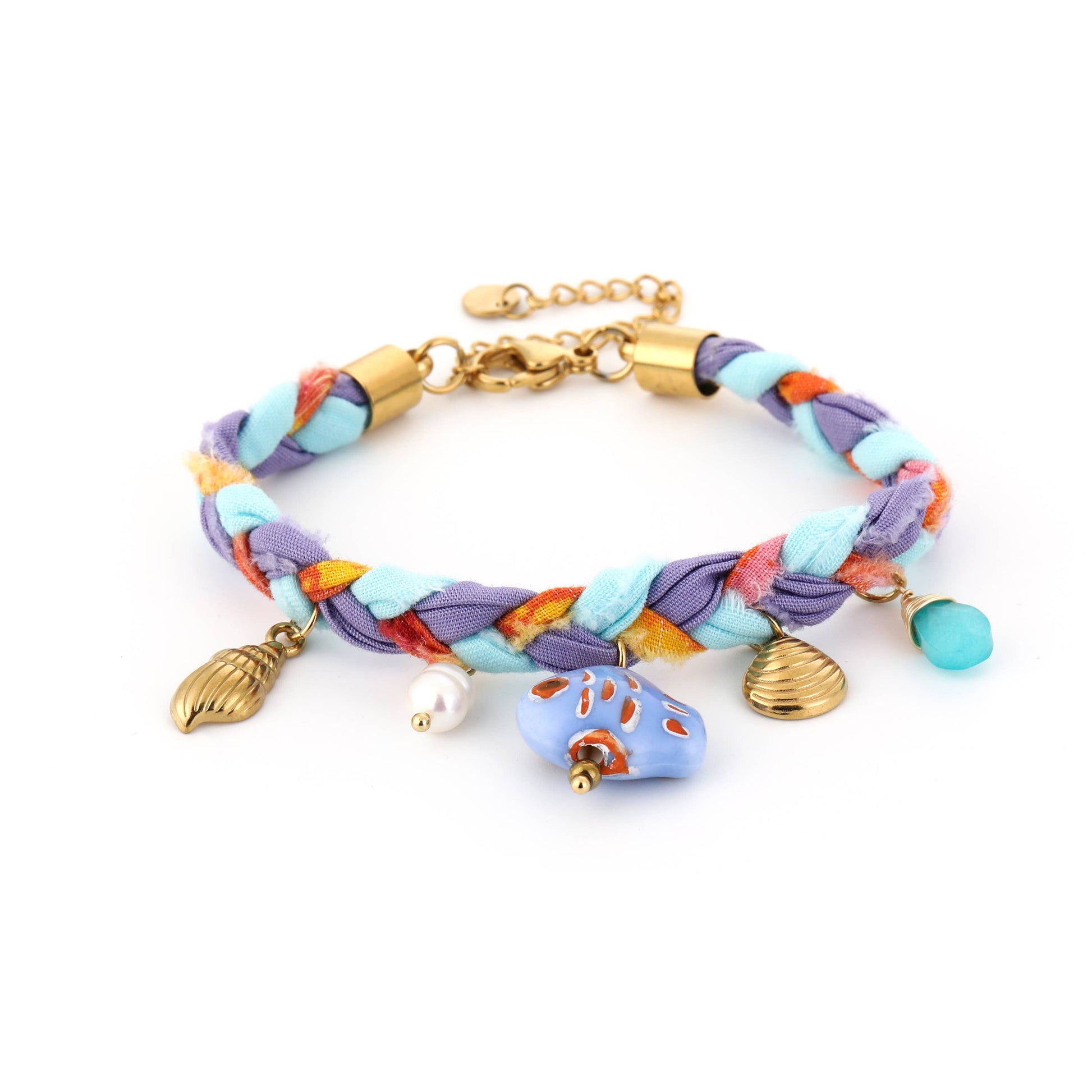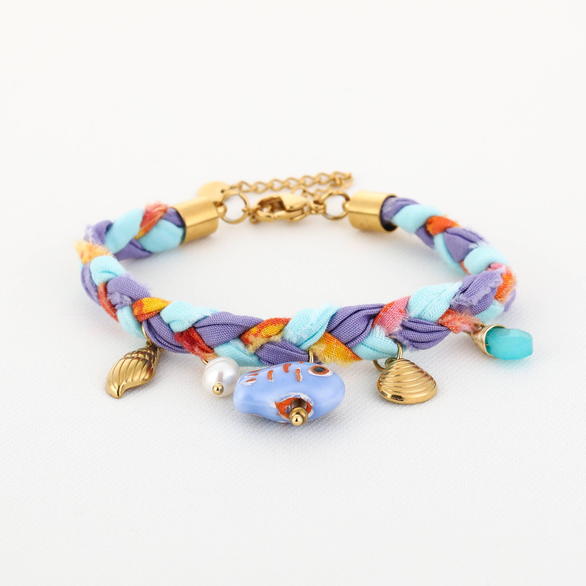 Brazalete de bandana con 1 colgante aleatorio de metal inoxidable. El brazalete de se cierra con un cierre de mosquetón y contiene una cadena de extensión. Trenzado de bandana en varios colores.