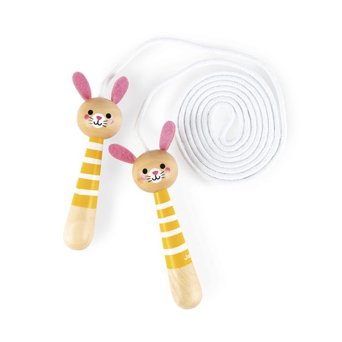 Divertida cuerda de saltar con adorables mangos de conejo en madera maciza y orejas de suave fieltro. Con sus 2 metros ajustables, este juguete clásico invita a brincar y girar mientras los pequeños desarrollan coordinación y resistencia. ¡Salta como un conejito hacia la diversión y el ejercicio!