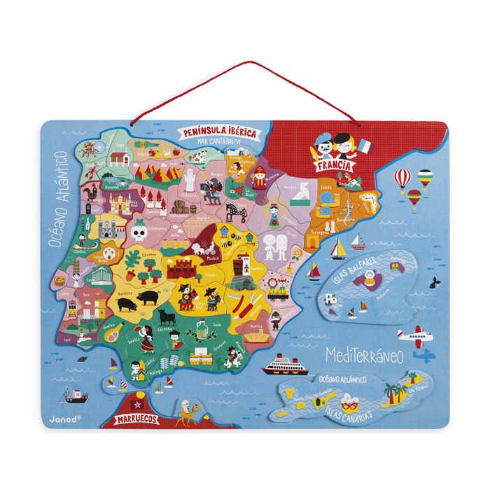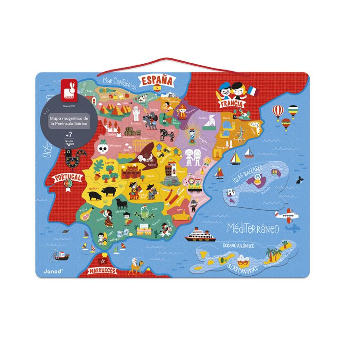 Descubre la geografía de la Península Ibérica de forma divertida con este juguete educativo de madera. ¡60 piezas magnéticas que representan cada provincia española y región portuguesa, ilustradas con especialidades locales! La pizarra muestra autonomías, regiones, mares, océanos, islas y países fronterizos. Ideal para niños a partir de 7 años que aprenderán jugando y podrán exhibir su mapa completo en la pared. ¡Geografía y diversión en un solo juguete!
