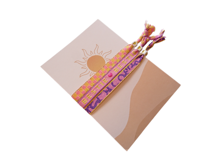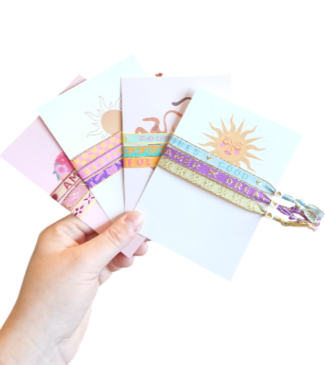 Tarjeta de felicitación con 3 pulseras de cinta diferentes con texto divertido. Las pulseras se cierran con un nudo corredizo y, por lo tanto, son ajustables en tamaño. Este conjunto.y se ve bien en su mostrador.