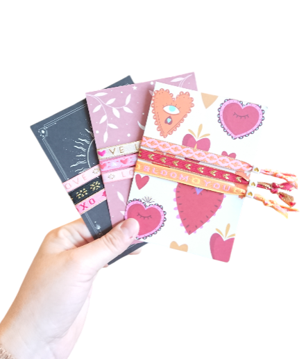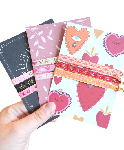 Tarjeta de felicitación con 3 pulseras de cinta diferentes con texto divertido. Las pulseras se cierran con un nudo corredizo y, por lo tanto, son ajustables en tamaño. Este conjunto incluye una tarjeta de felicitación.