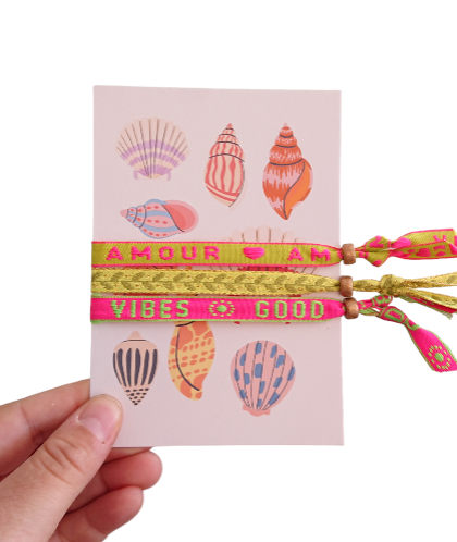 Set 3 Pulseras con texto, Tarjeta diseño de conchas marinas