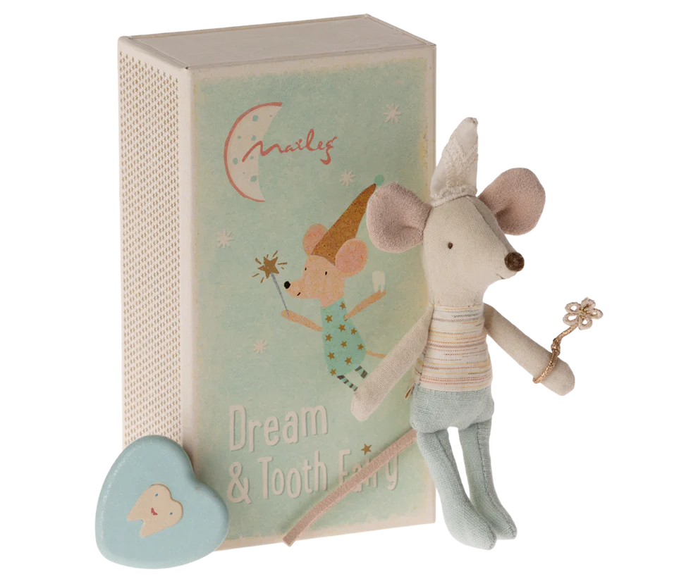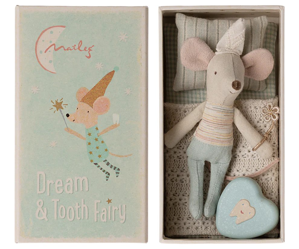 Por la noche, el Hada de los Dientes esparce polvo mágico mientras nuestro Ratoncito Hermano Pequeño se desliza bajo tu almohada. Este encantador set incluye un adorable ratoncito en su propia cajita de cerillas y un espacio especial para guardar los dientecitos. ¡La magia de los dulces sueños y las sorpresas nocturnas en un juguete que hará volar la imaginación de los pequeños!