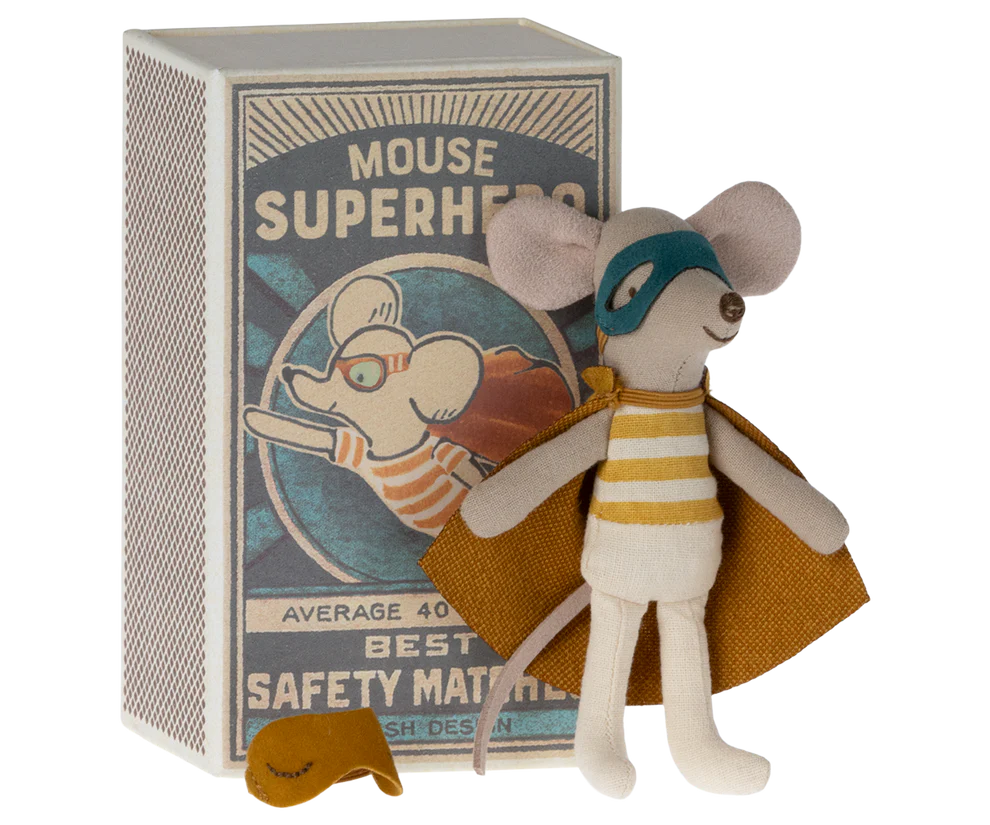 Ratón superhéroe, hermano pequeño en caja de cerillas