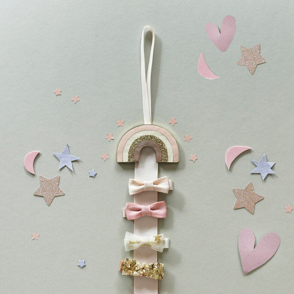 Organiza tus pinzas para el pelo con estilo gracias al colgador Rockahula. Su diseño arcoíris y cinta de grosgrain permiten colgar hasta 12 pinzas, manteniéndolas siempre a mano y listas para usar. Ideal para puertas o paredes, mide 53 cm de largo con 33 cm de espacio para tus clips favoritos. ¡Dale un toque divertido y práctico a tu rutina de peinado! (Pinzas no incluidas).