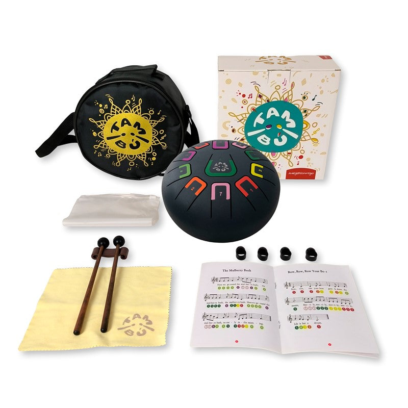 El Tambú es un instrumento musical perfecto para pequeños exploradores sonoros. Con 11 notas codificadas por colores y números, este tambor de 20cm produce melodías armónicas y relajantes. Tócalo con las baquetas incluidas, las púas de dedos o simplemente con tus manos para descubrir diferentes intensidades sonoras. Incluye partituras, bolsa de transporte y base estable con patas de goma. ¡Una divertida introducción al mundo de la percusión para niños desde 3 años!