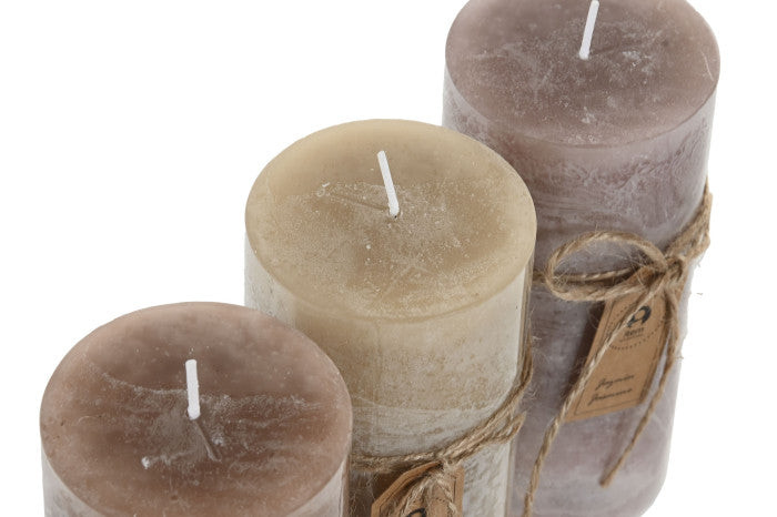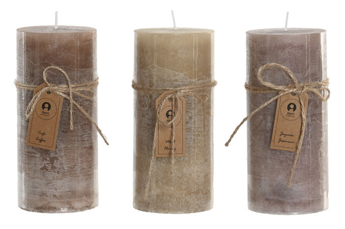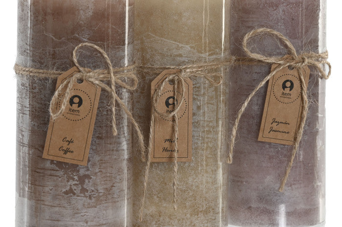 ¡Despierta tus sentidos con nuestro trío de deliciosas velas perfumadas! Cada vela de 6,5 x 6,5 x 15 cm arde durante 80 horas de placer aromático. Elige tu estado de ánimo: La marrón un intenso café para animarte, la rosa un romántico jazmín para ambientar o la beige una relajante fragancia a miel.